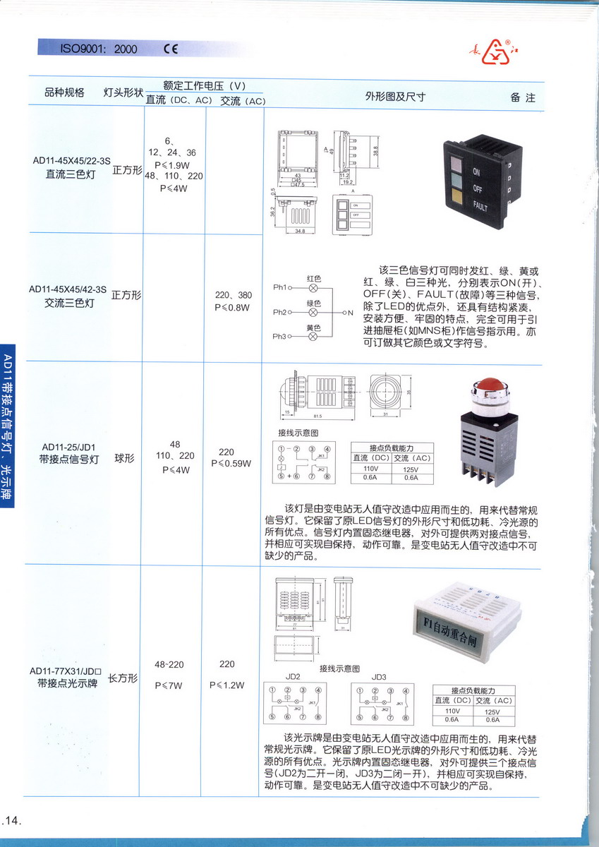 江阴长江电器有限公司由江苏长电科技股份有限公司控股,专业从事低压电器设计、制造的现代化合资企业。拥有雄厚的科研实力,先进的检测手段,完善的服务网络,健全的ISO9001:2000质量管理体系。上世纪九十年代初,公司在国内率先采用LED发光芯片制作出寿命长、可靠性高、耐震动的AD11系列节能信号灯,取代了以白炽灯和氖灯为信号指示灯的产品。近年来公司吸收引进国际先进的技术和装备,不断提高产品的科技含量和质量,产品的结构性能可与国际高档的同类产品相媲美。主导产品AD11系列信号灯、LA38系列按钮、CJK22系列信号灯及按钮以优异的性能、可靠的质量、一流的服务赢得了众多的客户,在国内市场上享有盛誉。产品绿色节能、安全可靠,广泛应用于电力、机械、能源、通讯、航天、运输、冶金、石化、纺织、船舶等行业。