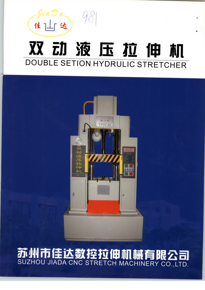 我公司是生产液压双动薄板拉伸机的专业化企业。主要产品有:数控YP30-AI、YP46-AI、YP65-AI、YP80-AI、YP100-AI、YP120-AI、YP160-AI。同时承接非标准拉伸机的设计与生产,产品畅销国内外。 本公司产品全部采用国外先进标准组织生产、注册商标“佳达”牌数控双动拉伸机,我公司有完善质量管理体系,完备的产品测试手段,灵活的销售渠道,热忱的服务态度,向您提供一切方便。真诚希望新老客户与我公司进行广泛的合作。我们的共同事业将在彼此的合作中突飞猛进。 该系列数控与电器双动拉伸机结构新颖、性能可靠、拉伸工艺精度高、操作方便、能耗低,是老式机床拉伸机的换代新品。广泛应用于日用五金、家电、汽车、医疗器材、消防器材、铝制品、搪瓷制品、不锈钢制品等等。可对不锈钢板、铜板、铝板、铁板等材料进行拉伸形成工艺。设计制造各种拉伸模具和冲压模。