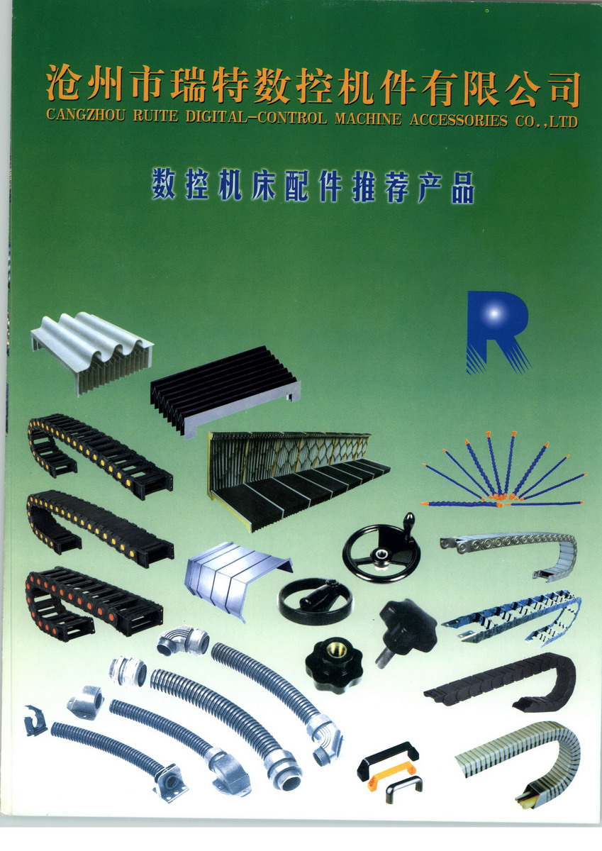 沧州市瑞特数控机件有限公司同意大利合资,共同致力于工业自动化产品的开发设计,生产和销售。主要产品有软管,软管接头,电缆防水接头,工程塑料桥式拖链,全封闭拖链,钢铝拖链, 矩形软管,导管防护套,冷却管,防护罩,防尘折布,铝合金卷帘罩,工作灯,操作件,吸尘管,垫铁,槽板,输送链条,排屑输送机,偏摆仪,刮屑板等。我公司的产品品种齐全,价格全国最低,交货及时,如果您在安装有何不解,或有什么愿望和想法,请及时来电来函与我们联系,我公司在24小时内帮您解决。我公司将以一流的质量,良好的信誉,为用户提供满意的服务,并热诚与国内外同仁广为合作,为发展数控配套产品做出贡献。发挥本公司优势,加速技术创新,使祖国数控更快发展,是瑞特人的心愿。