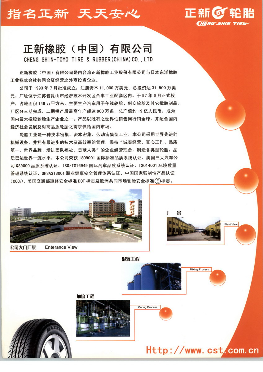 厦门正新橡胶工业有限公司,成立于1989年5月,为正新厦门集团总公司。正新轮胎创建于台湾,自1967年迄今,正新集团已发展成为全球第九大轮胎制造商,也是同行业中发展速度最快的轮胎生产商之一。以诚实经营、品质第一的经营理念营销全球。截止目前,正新在全球一共有5个研发中心并拥有17座生产基地,横跨五大洲,总员工人数超过20000人,销售网络遍布140多个国家。