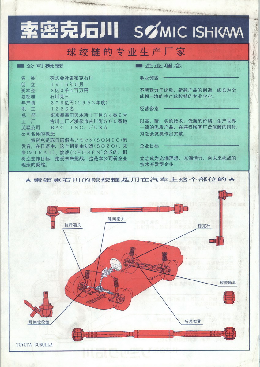 公司自1995年由绍兴第二汽配厂与日本索密克石川株式会社和丰田通商株式会社三家合资成立后,积极吸收日本的先进管理理念,引进日本先进的生产技术。因此,索密克公司的发展过程,是不断创新管理、技术,拓展市场的发展史。