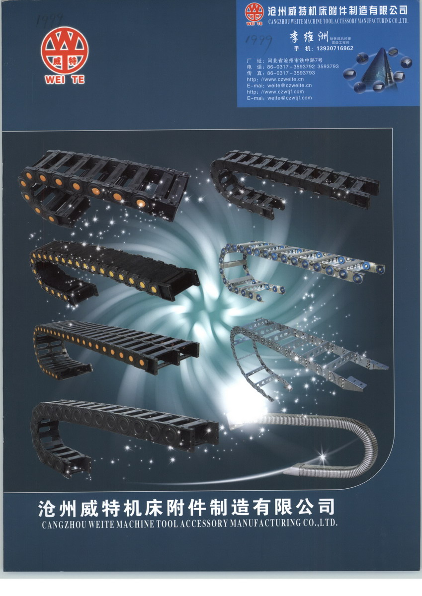 沧州威特专业生产各种机床防护罩、系列排屑机各种规格拖链,工作灯及其它机床附件。生产的柔性风琴防护罩(盔甲式,低速式,中速式,高速式 )防尘、防铁屑、防水、防油、防乳剂和化学药品,运行平稳。钢板(不锈钢板,冷板)防护罩外形美观,防铁屑、防水、防油、耐拉伸、撞击不变形、使用寿命长。生产的输送机有螺旋输送机,刮板输送机,链式输送机,皮带输送机,辊式输送机,磁性输送机等,根据不同的制作材质和不同的使用需要又衍生出多种产品规格供你选择。另有:防尘折布;丝杆丝杠防护套;螺旋钢带保护套、钢铝拖链、工程塑料拖链、矩形金属软管、可调塑料冷却管、铝型防护卷帘、蛐纹弹簧吸尘管、导轨刮屑板、减震垫铁、调整垫铁、T型撞块槽板系列等产品。