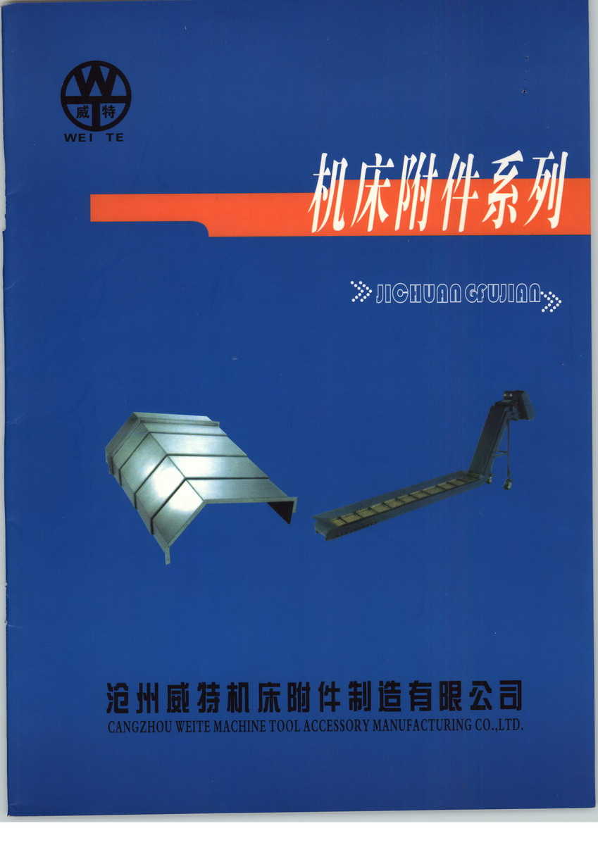 沧州威特专业生产各种机床防护罩、系列排屑机各种规格拖链,工作灯及其它机床附件。生产的柔性风琴防护罩(盔甲式,低速式,中速式,高速式 )防尘、防铁屑、防水、防油、防乳剂和化学药品,运行平稳。钢板(不锈钢板,冷板)防护罩外形美观,防铁屑、防水、防油、耐拉伸、撞击不变形、使用寿命长。生产的输送机有螺旋输送机,刮板输送机,链式输送机,皮带输送机,辊式输送机,磁性输送机等,根据不同的制作材质和不同的使用需要又衍生出多种产品规格供你选择。另有:防尘折布;丝杆丝杠防护套;螺旋钢带保护套、钢铝拖链、工程塑料拖链、矩形金属软管、可调塑料冷却管、铝型防护卷帘、蛐纹弹簧吸尘管、导轨刮屑板、减震垫铁、调整垫铁、T型撞块槽板系列等产品。