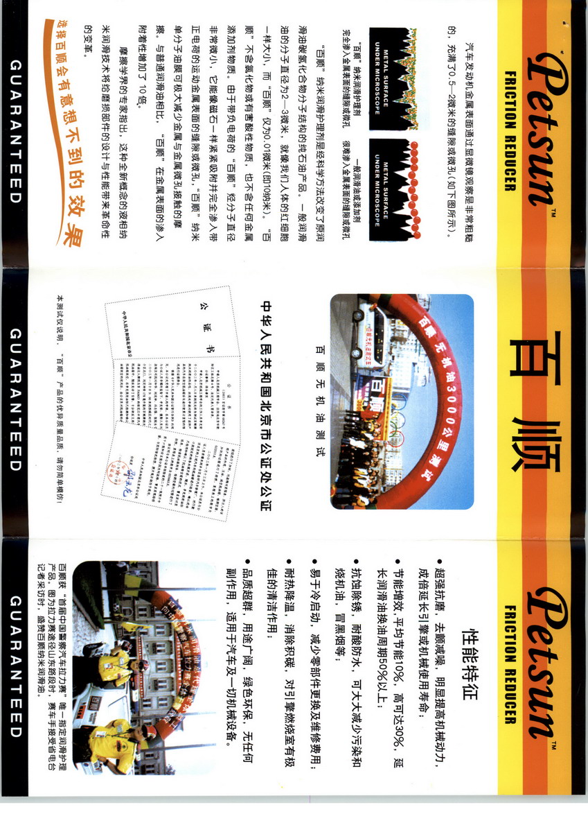 我北京百顺华美科技有限公司代理美国百顺(Petsun)液相纳米润滑护理剂,同时公司为专业润滑油生产企业,所生产的百顺纳米润滑油(车用及工业用油)是选用优质基础油和国外复合添加剂及纯烃纳米单分子护理剂科学调制而成,与当今世界领先地位的高效节能、低磨损、低污染、快启动、长久耐用的润滑油品总趋势同步!百顺纳米润滑油北京生产基地作为美国PETSUN国际公司授权加工调配基地,已融入当代高新科技和21世纪企业经营理念,产品通过ISO9001质量和ISO14001环境国际体系认证。符合美国石油学会API标准,美国汽车工程师协会SAE标准,欧洲汽车制造商协会ACEA标准及中国国际标准ISC产品认证,产品品质达到国际领先水平。