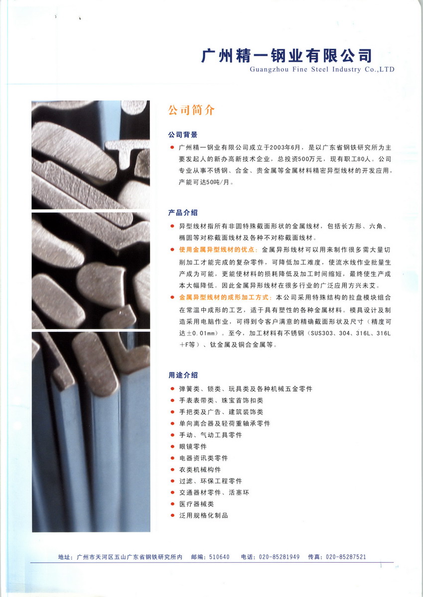 广州精一钢业有限公司办公室地址位于中国的南大门羊城广州,广州 五山路广东省钢铁研究所内(邮编:510640)(行政区号:440106),于2003-06-16 在广州工商局注册成立,注册资本为200(万元),在公司发展壮大的14年里,我们始终为客户提供最好的产品、良好的技术支持、健全的售后服务,我公司主要经营生产、加工、销售:金属新及制品、电子新材料及制品、开关记忆合金及制品、高性能特种合金材料及制品、特种 金属粉末及粉末冶金制品、贵金属复合材料、特种用途钢丝、特种铜合金材料及制品。开发、生产、销售:五金,我们有最好的产品和专业的销售和技术团队,公司座机电话是85280930,我公司是广州金属制品业黄页行业内知名企业,如果您对我公司的产品服务有兴趣,期待您在线留言或者来电咨询愿与社会各界同仁携手合作,谋求共同发展,继续为新老客户提供最优秀的产品和服务。公司与多家广州金属制品业黄页零售商和代理商建立了长期稳定的合作关系,品种齐全、价格合理,企业实力雄厚,重信用、守合同、保证产品质量。