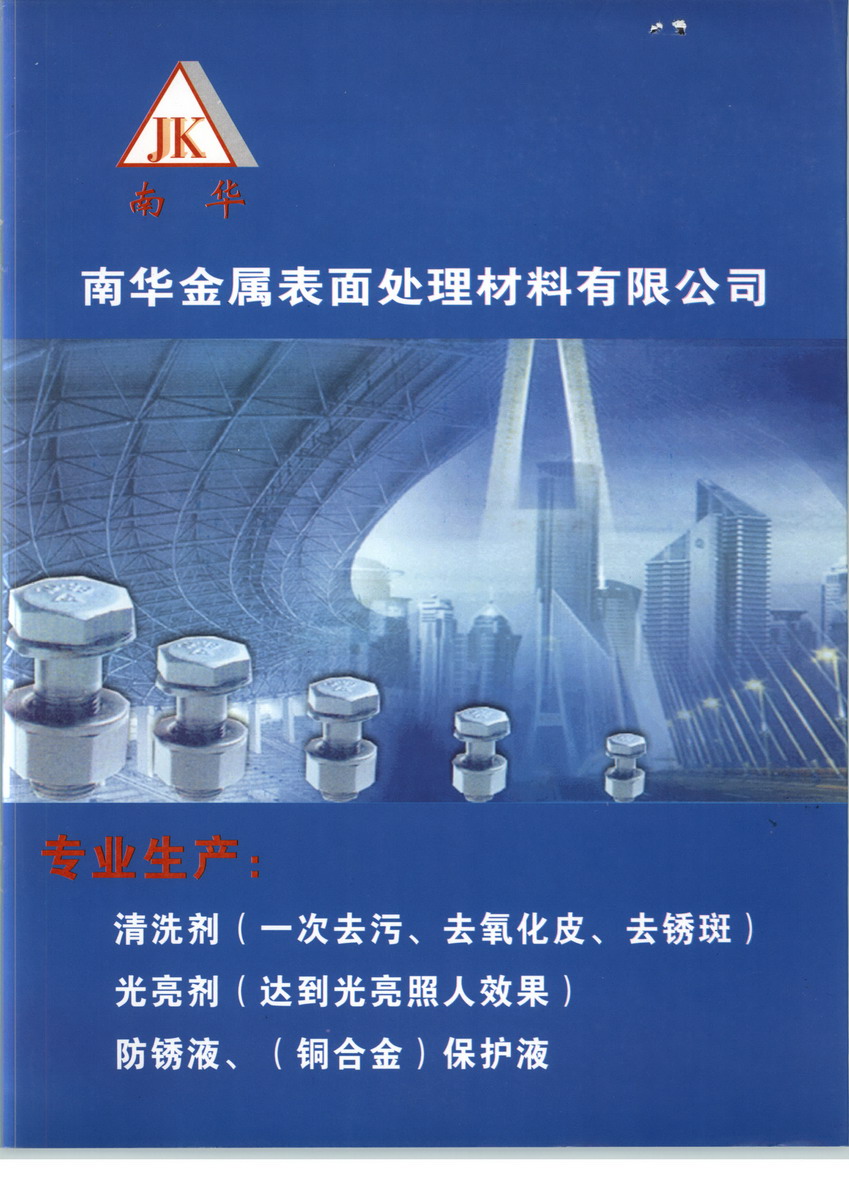 南华金属表面处理材料有限公司 公司介绍: 本公司采用美国纳米**技术与配方生产的各种光亮剂,清洗剂,研磨剂,防锈剂,塑料抛光剂, 眼镜配件抛光剂, 脱脂剂,除油王,除蜡水,冷托剂。**推出的JK-158A,168A光亮剂在不锈钢紧固件,弹簧表面处理方面更有独到之处。同时还可以起到去污,去锈,去油,去氧化皮,使不锈钢产品达到光亮照人的效果。该产品具有环保,安全,高效,快速,节能等特点。该产品是目前市场上最理想的产品,同时我们提供不锈钢冷墩加热器及抛光设备,为客户参与国际竞争提供有力保证。现诚招全国各地区域代理,有意者请来电咨询。