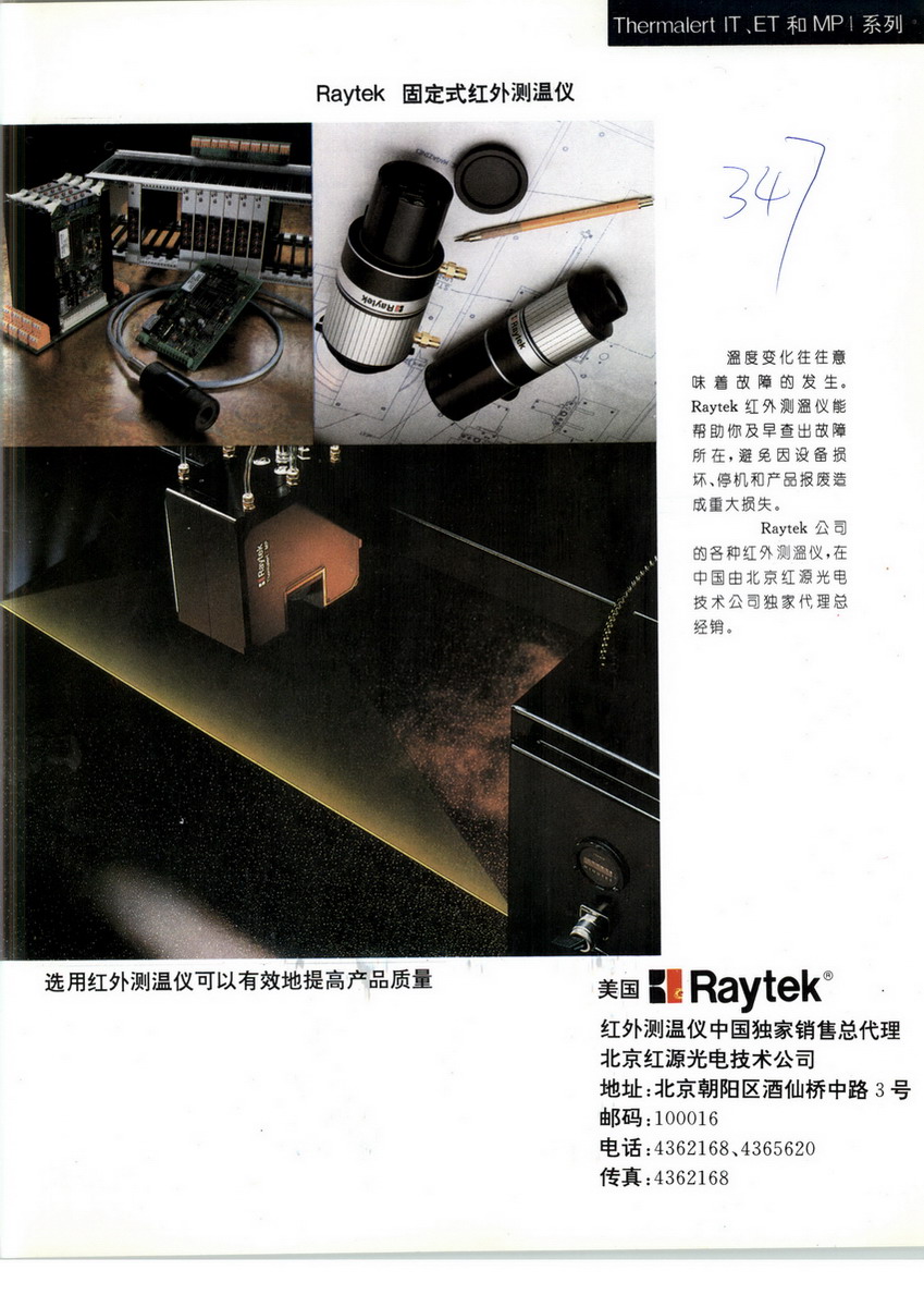 北京红源光电技术公司成立于1988年,是北京市的高新技术公司。经过二十年的不懈努力,公司在产品质量,生产能力,新品研发以及基础建设等方面都得到了新的提高和发展,至今已成为集红外光学镜头、红外热像仪设计生产以及销售红外产品为一体的专业公司,其产品已经被国内外的许多单位所采用。2010年1月通过ISO9001质量管理体系认证。公司自成立之日起,便利用自己的专业优势从事高科技产品的研制、生产和销售业务。1989至1994年作为美国Raytek公司红外辐射测温仪在中国的销售总代理,1995年与该公司共同投资成立了中美合资北京雷泰光电技术有限公司,为红外测温仪在中国广泛应用打开了道路。近年来,公司的业务有了较大的发展,在已经能大批量生产各种固定式红外镜头的基础上,又先后研制出了用于改变热像仪视场的变倍镜头、双视场变换镜头、连续变焦镜头、近焦镜头等。目前公司已有能力为用户设计、制作各种特殊用途和规格的红外镜头。并利用公司在红外镜头方面的实力,陆续推出了采用美、英、法等国生产的非制冷焦平面组件、配以不同的红外镜头,组成了能用于安全监控、夜间观察等用途的手持式或固定式热像仪。公司还代理销售美国FLUKE公司和FLIR公司的测温仪和热像仪等产品,在国内获得大量用户的好评。为了保证产品的质量,公司建立了质量保证体系,成立了质保部门。购置了环境试验设备、红外镜头和热像仪的监测装置等。