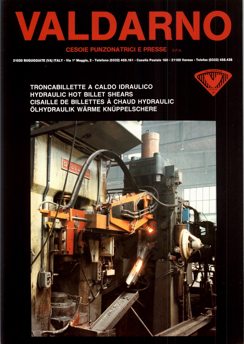 Valdarno, established in 1949, is located in the Varese area of Northern Italy and extends on a 25000 mq ground, 5000 of which are occupied by factory and offices.Operating from spacious, modern premises, Valdarno has established a high reputation in the international metallurgical, engineering and metal forming industries.From a constructor of simple shears for the construction industry, the operation has evolved to include hot & cold billet shears, presses for pre-forming, trimming & sizing, as well as integrated production lines, for a wide range of products such as leaf & coil springs, bolts, engine valves, high pressure pipe fittings & a variety of forged parts.The collaboration between Valdarno's team of skilled engineers & leading Italian Universities, facilitates the constant upgrading of products to incorporate latest developments in control system & materials.This combination of tradition & technological innovation has resulted in Valdarno equipment being selected by leading metal forming companies world-wide.Valadrno ensures a constant service for studying special solutions in cooperation of the customers' engineers, in observance of the latest E.C regulations.