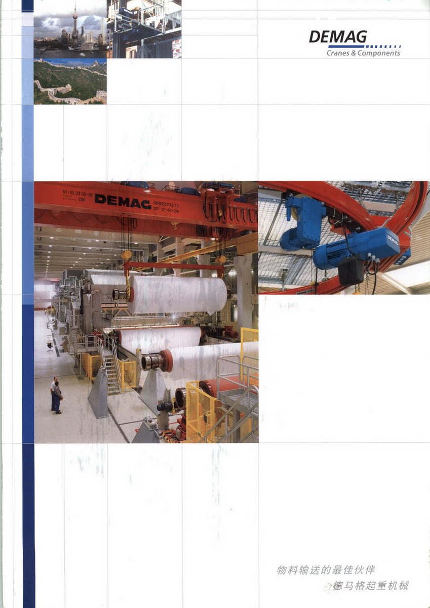 德马格起重机械的历史开始于1819年在魏特鲁尔区的机械工厂。公司在1840年已经开始生产桥式起重机,早日专注于生产起重机和起重机部件, 同时在1910年开始也包括了电驱动的提升设备。今天,德马格起重机械是一个坐落在德国的全球性企业,子公司和许多合作代理商遍布世界各地。基于产品种类中的驱动产品,轻型起重机和标准起重机业务,德马格起重机械为小型工作坊到大型工业的各类公司提供物流,工业驱动产品的解决方案。 德马格中国德马格自1994年开始在中国开展业务,经过数十年努力,我们现在已在上海奉贤庄行欧洲工业园区建立了全新的现代化工厂。新工厂以全部产品本地化为原则,采用最先进的德马格技术及工艺进行产品的生产、组装、调试及安装。这些起重机按照国际标准制造并符合国内行业规定,具有恒定的高品质。它们自重轻,起重能力强,能大大降低厂房的建造费用。我们的组件和设备的标准化程度极高、质量稳定、性能可靠。作为世界同行中的领先企业,德马格拥有最先进的技术,极富创造力的工程师以及可靠的零配件供应,这一切优势均为产品的保养及售后服务提供了保障。设立在上海的生产基地同时还拥有系统化的立体仓库,能够在工业生产中保证高生产率和连续的供货能力。德马格产品种类丰富、应用范围广,设有三个产品部门-标准起重机部门、轻型起重机部门、驱动产品部门。不论您需要的是驱动运行机构或工位搬运装置,还是生产线起重设备或仓库储运装置,德马格都能为您提供针对性的解决方案。在中国,德马格起重机械公司已为各行各业的用户提供了大量性能优异的起重搬运设备,用户满意就是我们的动力来源。 德马格起重机械(上海)有限公司不仅在上海设立有生产基地,同时在北京、天津、重庆、广州、武汉等各大省市自治区设有办事处。我们的销售工程师不仅熟悉自己的产品,而且了解各行各业用户在物料搬运方面的需求。他们愿来到您身边为您提供咨询并拟定最理想的解决方案。实现物料输送技术现代化,对提高工业企业的生产竞争力至关重要,我们将帮助您加速这一进程。