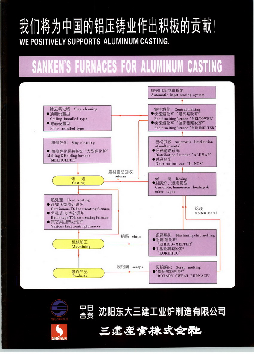 沈阳东大三建工业炉制造有限公司成立于1997年,由中国东北大学与日本三建产业株式会社合资创办 ,主要业务范围是工业炉的开发、设计、制造、维修及相关咨询服服务 。东北大学是一所以工为主,理、工 、文、管、经济及教育相结合的多学科性国家重点大学,为教育部直属高校 ,首批进入国家重点建设的 “211”工程高校之一,同时是“985工程”重点建设学校 ,是中国近代工业炉的摇篮 。日本三建产业株式会社成立于1949年,是专门从事工业炉制造的专业公司。在工业炉设计 、制造领域已逾60载,积累了丰富的经验和雄厚的技术力量。其产品以高性能、低能耗而著称。沈阳东大三建工业炉制造有限公司总部位于沈阳市苏家屯区,总部办公楼与制作工厂相邻,实现设计、制作一体化,并在广州、昆山、重庆和济南分别设有分支结构,为客户提供高品质的产品与服务。公司产品覆盖铝合金铸造、锻造行业,钢铁重机行业及表面处理行业。