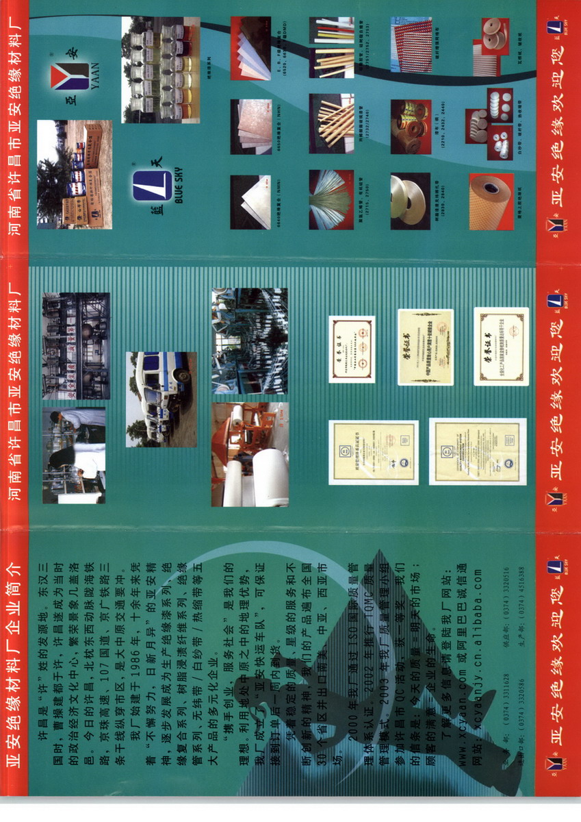 河南省亚安绝缘材料厂有限公司是专业生产绝缘漆、绝缘复合纸、绝缘绑扎带的生产厂家。河南省亚安绝缘材料厂有限公司致力于为客户提供高品质的绝缘漆、绝缘复合纸、绝缘绑扎带等绝缘材料产品和高效率的专业化服务。河南省亚安绝缘材料厂有限公司始建于1986年,原名许昌市魏都区亚安绝缘材料厂,2008年企业完成改制并正式更名为河南省亚安绝缘材料厂有限公司,2009年亚安绝缘成功并购具有52年漆布生产经验的许昌市新文峰绝缘材料厂。建厂伊始,亚安绝缘就以“今天的质量,明天的市场;顾客的满意,企业的生命”为核心理念,严把质量关,不断完善,持续改进,以优质的电工电气绝缘材料产品和优良服务回报每一位客户。二十余年来,借着中国经济发展的大势,凭着“不懈努力、日新月异”的亚安精神,企业逐步发展为生产B级、F级、H级系列绝缘材料包括漆、绝缘纸(绝缘柔软复合箔)、绝缘浸渍制品的专业化生产厂家。河南省亚安绝缘材料厂有限公司主要产品包括B/F/H级有溶剂无溶剂绝缘漆、6520青复合绝缘纸、6630DMD绝缘纸、6641DMD绝缘纸、6640NMN绝缘纸、6650NHN绝缘纸、MGM玻璃布聚酯薄膜复合绝缘纸、聚酯薄膜漆布复合绝缘纸、油性漆布黄蜡稠、醇酸玻璃漆布、聚酯玻璃漆布、有机硅玻璃漆布等。亚安绝缘材料厂产品绝缘系统为美国UL认可的B/F/H级绝缘系统(UL档案号:E310670),通过欧盟ROHS环保认证。亚安绝缘材料厂凭借50余年的经验与创新为众多军工、电机、变压器企业提供高品质的绝缘材料产品与可信赖的专业化服务。营销出市场,管理出效益。亚安绝缘材料厂在管理模式上不断学习,不断创新。2000年,企业顺利通过了ISO9001国际质量管理体系认证。2002年,企业推行TQM全面质量管理模式。2005年开始,亚安绝缘全厂学习和开展“5-S活动”,并倡导“走动式管理”。多年来,通过不断探索,突破机制的束缚,剪除定势的缠绕,亚安绝缘材料厂找到了适合自己的管理体系,企业的电工绝缘材料生产经营活动简洁,高效,有序。在全球经济一体化的进程中,河南省亚安绝缘材料厂有限公司在做稳国内市场的同时,把眼光投向了国际市场。2003年国际部成立至今,电工绝缘材料产品已出口到130余个国家,产品质量和服务得到了外商的一致好评。