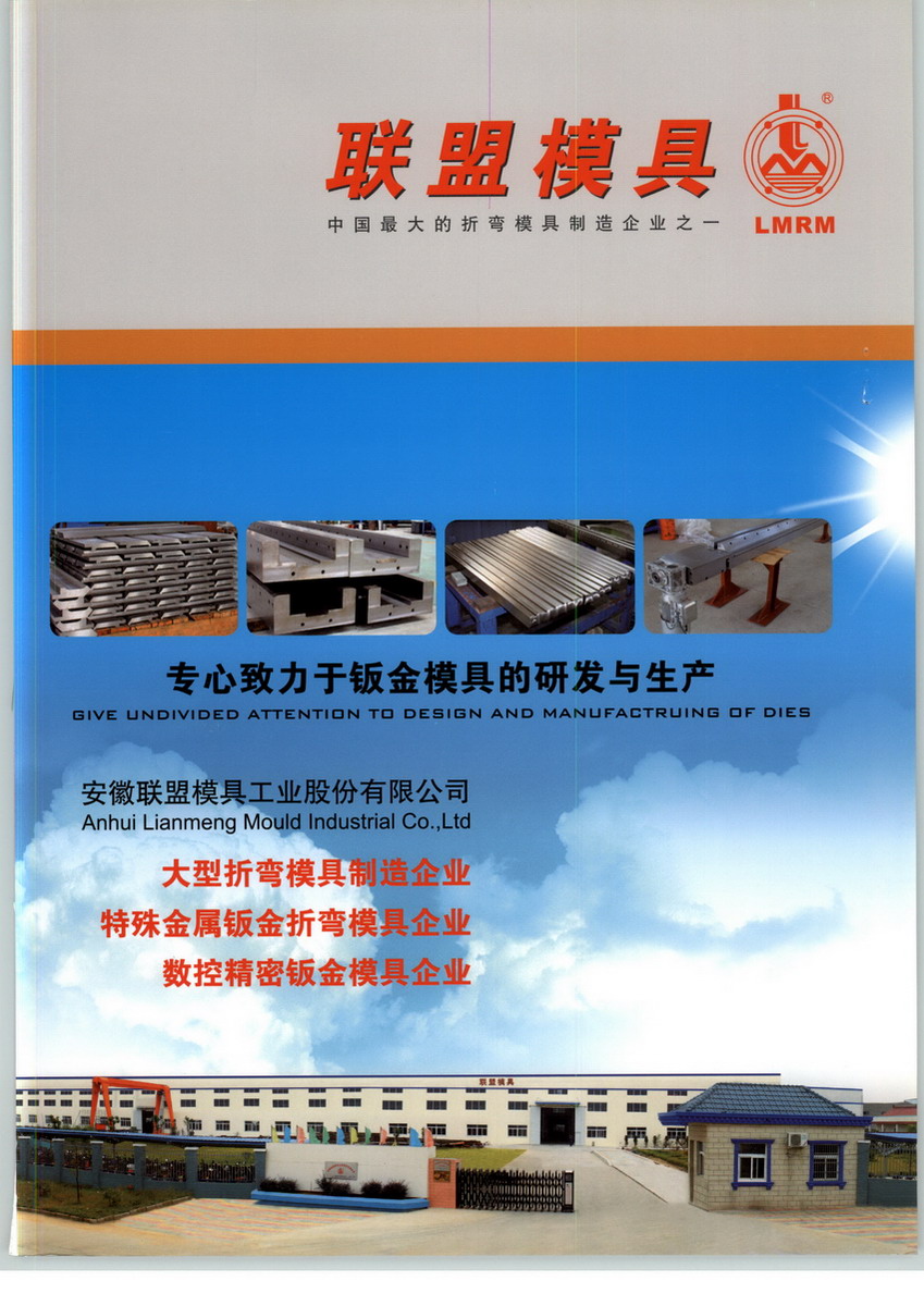 安徽联盟模具工业股份有限公司,成立于1995年,位于南京都市圈中国刃模具之乡——博望镇,专业于制造高精密数控折弯机模具、大吨位数控折弯机模具、无压痕成形模具、下模自动开口可调模具、特殊成型模具、折弯机模具固定夹紧部件、折弯机补偿机构、剪板机刀片、非标折弯机模具系列等高精度、长寿命的高品质的薄板及中厚板折弯成形模具,公司经过近二十年的不断壮大,已成为国内中高端钣金折弯成形模具行业的领先企业,产品覆盖全国各地,并远销东南亚、中东和欧洲地区,公司品牌“LMRM”获得安徽省著名商标认证并拥有多项国家专利。安徽联盟模具工业股份有限公司坚持技术领先战略,坚定不移地走在创新之路上,经过多年的实践,已在折弯模具特别是数控折弯模具设计、开发上形成自己的特色。重点客户群为:(1)工程机械行业、卡车行业、轨道交通业、电梯制造业、医疗机械制造业,厨房设备制造业、石油和天然气管道及直缝管制造等企业;(2)大型机床制造企业配套。为满足国内外市场对大尺寸、高精度、长寿命数控折弯机的需求,我们立足于技术创新,开发新一代数控折弯模具,主要是大尺寸、长规格及无压痕折弯模具和数控加凸工作台的研制,以填补国内相关技术的空白。公司的研发中心结合有限元技术和优化理论,重点研究加凸补偿技术、无压痕成形方法、折弯回弹控制、模具磨损与寿命分析、模具结构优化等折弯机理与工艺过程,以不断进行企业自主创新,掌握数控折弯模具高端、核心技术,形成生产规模,为更多机床制造商和钣金企业服务。