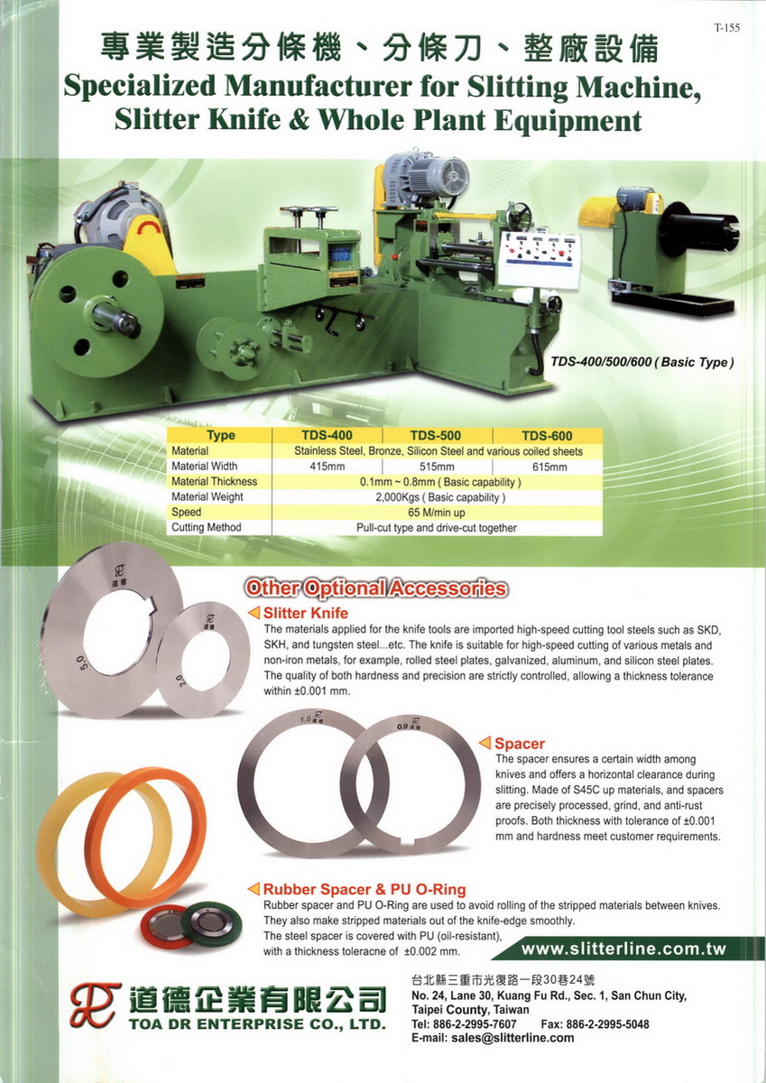為滿足客戶之需求,各種尺寸之分條機、分條刀、鋼套及周邊附件,皆完全自製,分條機裁切厚度能力達0.03m/m以上。舉凡銅、鐵、鋼板、不鏽鋼等各種特殊材料皆能輕易迎刃而解,達到最高附加價值之產品,各種機型設備,特殊規格亦能接單製作。產品遍及世界各地,巴西、俄羅斯、日本、大陸及東南亞各國皆有銷售實績。道德公司以「誠信、專業、創新」為本的精神來服務客戶,製造出高質量、高性能的產品,為客戶創造出更高的附加價值。