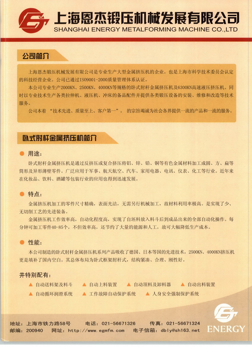 上海恩杰锻压机械发展有限公司是专业生产大型卧式金属挤压机的企业。也是上海市科学技术委员会认定的科技经营企业。本公司专业生产2000KN、2500KN、4000KN等规格的卧式肘杆金属挤压机。同时以专业技术生产各类拉伸机、液压机、冲床的备品配件并提供各类锻压设备的安装、维修和改造等技术服务。公司本着 “技术先进、质量至上、客户。” 的宗旨竭诚为社会各界提供一流的产品和一流的服务。