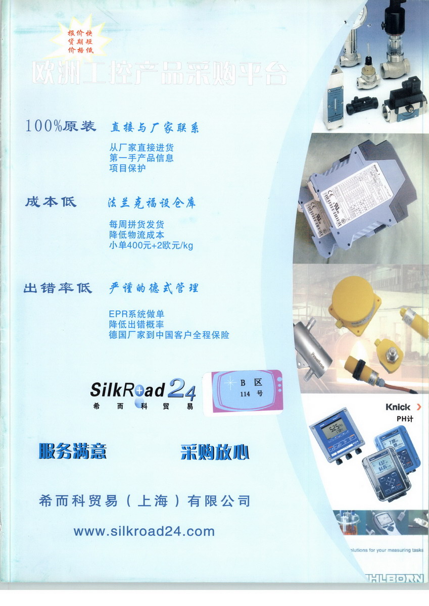 Silkroad24于1999年在德国Braunschweig市成立。成立之初,德国Silkroad24 即“丝绸之路全天候”作为欧洲德语区(德国,奥地利,瑞士等)多家著名自动化中小企业的中国总代理,主要负责其中国市场的开发以及销售管理。2006年Silkroad24希而科贸易(上海)有限公司在上海张江高新科技园成立,其发展目标是成为国内领先的欧洲自动化仪器仪表,备品备件供应商。时至今日,在张江高新科技园区拥有办公面积800多平米,仅德国供应商就达400多家,应用领域包括钢厂、电厂、化工、汽车、机械、流体、自动控制等行业。公司实行严格的德式管理,内部分为业务部,后勤部,技术部,组织结构清晰,分工明确,公司工程师都是本科及本科以上学历,提供选型,商务加售后服务,并指导安装调试。ERP系统做单,可以提供订单全程查询。德国法兰克福仓库拼货,为客户节约了成本,提高了采购效率。我们直接与欧洲厂家联系,快捷,有效的沟通,提供100%原装正品,真正做到了让客户服务满意,采购放心。