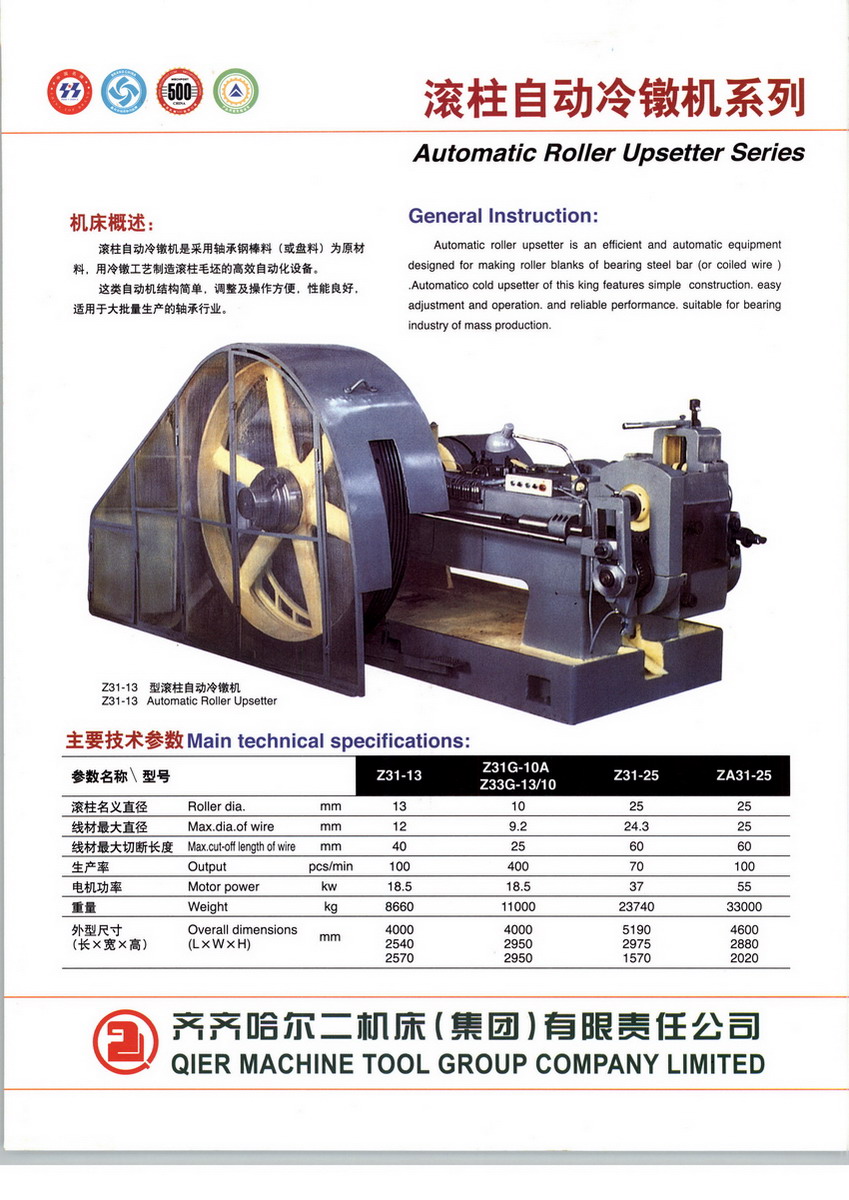 齐齐哈尔二机床(集团)有限责任公司(由原齐齐哈尔第二机床厂改制)1950年10月于沈阳北迁建厂,是"一五"期间我国机械工业第一批重点骨干企业,闻名全国的马恒昌小组所在企业。建厂以来,多位党和国家领导人亲临企业和小组视察。经过六十多年的发展建设,企业已成为我国重型机床及锻压设备的著名生产基地,国家"十一五"发展数控机床产业化专项重点扶持企业,中国重型机床龙头企业,为我国32个省、市、自治区和世界五大洲40多个国家和地区提供了近6万台(套)机床装备,其中,为国防、军工、航空、航天、船舶、汽车、能源等国家重点行业和领域提供单机超百吨装备2000余台,为国家基础工业建设和国防建设做出了重要贡献。企业荣获全国"五一"劳动奖状,全国思想政治工作优秀企业,国家创新型企业、中国工业行业排头兵企业、机床行业自主创新、数控产值、销售收入、精心创品牌活动、综合经济效益五项十佳企业、中国机械500强等称号。历史沿革:1970年10月前为中央直属企业,到1987年期间为省直属企业,1987年至2008年7月为市直属企业,2008年7月1日,齐二机床正式加入中国通用技术(集团)控股有限责任公司,标志着齐二机床重新回归央企行列。历史上创造了共和国多项第一:1958年与北京机床研究所合作研制我国第一台数控立铣,翻开了中国数控机床发展史的第一页;1975年研制完成我国第一台数控龙门铣;1993年研制完成我国第一台重型数控落地铣镗加工中心;1994年研制完成我国第一条重型数控多连杆压力机生产线。建厂以来,已累计生产各种机床6万余台,其中单机重量超百吨重型金切机床、锻压机械达1000余台,填补了国家百余项空白,为基础工业和国防建设的加强提供了大量关键重大设备。人员状况:现有人员5002人,具有各级各类中高级专业技术职称和技术等级1429人,其中:研究员级高级工程师4人;工程师、高级工程师336人;技师、高级技师871人。现有大专以上学历2091人,其中博士生2人、硕士生81人、本科生752人。享受国务院特贴3人,享受省政府特贴4人,享受市政府特贴4人,省、市学科(专业)带头人3人。占地面积:总占地面积54万平方米,厂房建筑面积20万平方米。设备状况:拥有各种生产设备1930台,其中:金属切削机床1007台,大、精关键设备227台。具有国际先进水平的进口把关设备有:德国数控卧式铣镗加工中心、数控螺旋伞齿轮磨齿机、精密导轨磨、数控凸轮磨;瑞士玛格梳齿机、磨齿机;意大利茵塞落地铣镗加工中心;日本本间数控龙门铣床、森精机立式加工中心;俄罗斯数控龙门镗铣床等。重点产品:数控落地铣镗床系列产品、数控龙门镗铣床系列产品、数控立式车床系列产品、数控铣床及加工中心、机械压力机及自动锻压设备,以及大型数控缠绕机、五轴联动混联机床、数控龙门高速铝锭复合加工生产线等大型数控专机。产品突出"重"字,重型、超重型类机床产品产值率达到80%,重型金切机床产值位居国内同行业第一。2010年,"齐二"牌商标被国家工商总局认定为"中国驰名商标"。至此,"齐二"品牌是全国机床行业里集"中国驰名商标"、"中国名牌产品"、"国家免检产品"三项顶级荣誉于一身的唯一品牌,成为全国消费者最信赖的机床销售品牌之一。