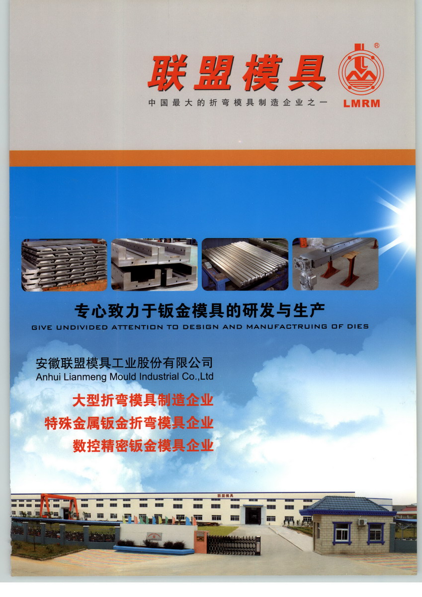 安徽联盟模具工业股份有限公司,成立于1995年,位于南京都市圈中国刃模具之乡——博望镇,专业于制造高精密数控折弯机模具、大吨位数控折弯机模具、无压痕成形模具、下模自动开口可调模具、特殊成型模具、折弯机模具固定夹紧部件、折弯机补偿机构、剪板机刀片、非标折弯机模具系列等高精度、长寿命的高品质的薄板及中厚板折弯成形模具,公司经过近二十年的不断壮大,已成为国内中高端钣金折弯成形模具行业的领先企业,产品覆盖全国各地,并远销东南亚、中东和欧洲地区,公司品牌“LMRM”获得安徽省著名商标认证并拥有多项国家专利。安徽联盟模具工业股份有限公司坚持技术领先战略,坚定不移地走在创新之路上,经过多年的实践,已在折弯模具特别是数控折弯模具设计、开发上形成自己的特色。重点客户群为:(1)工程机械行业、卡车行业、轨道交通业、电梯制造业、医疗机械制造业,厨房设备制造业、石油和天然气管道及直缝管制造等企业;(2)大型机床制造企业配套。为满足国内外市场对大尺寸、高精度、长寿命数控折弯机的需求,我们立足于技术创新,开发新一代数控折弯模具,主要是大尺寸、长规格及无压痕折弯模具和数控加凸工作台的研制,以填补国内相关技术的空白。公司的研发中心结合有限元技术和优化理论,重点研究加凸补偿技术、无压痕成形方法、折弯回弹控制、模具磨损与寿命分析、模具结构优化等折弯机理与工艺过程,以不断进行企业自主创新,掌握数控折弯模具高端、核心技术,形成生产规模,为更多机床制造商和钣金企业服务。