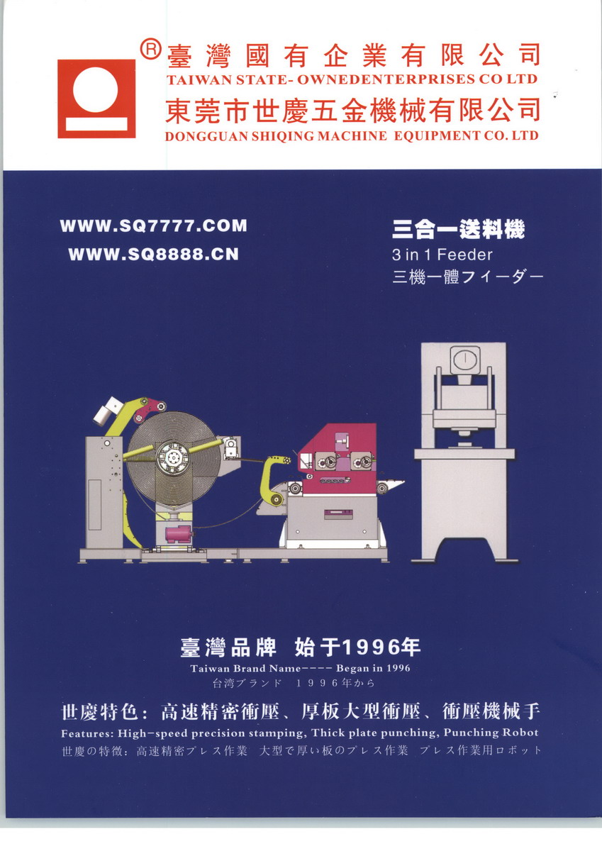 东莞市世庆五金机械有限公司总公司位于世界制作之都东莞,是台湾老牌冲压周边厂家,全球知名品牌之一,也是全球产品种类最齐全的生产厂家之一。于1996年在东莞设立的大陆地区总部,参考先进国家技术,专业生产与销售冲床周边自动化系列的机械设备以及整厂设备。本公司具有精良的技术和多年的经验,满足客户的生产需求,以优良的品质及热忱高效、优质的售后服务作为精神和基本政策。长久以来,因产品品质的不断改进及定期为客户做产品检修与服务。得到广大客户的大力支持与高度信赖,造就世庆公司在商业界的良好形象,与此同时,产品的品质也赢得了客户的一致好评。 随着市场占有率的提高,产品不仅销售中国大陆各地、还远销世界很多国家,并成功登陆日本市场。世庆的销售网路遍及中国大、中、小城市,并在上海、宁波、福州、厦门、中山等城市设有分公司和办事处。世庆五金冲床周边设备为众多电脑、电子、手机、五金等与之相关的企业提供了理想的设备。公司的售后服务机制完善,服务快捷,24小时专业维护,及时解决客户的疑难问题,展望未来,公司将秉持"诚实守信、品质'专业、服务"为我们服务大众的宗旨,"品质第一,用户至上、互利互荣"更是公司全体同仁共同遵循的经营理念.这个理念将激励我们努力不懈,为广大客户提供更高层的服务。