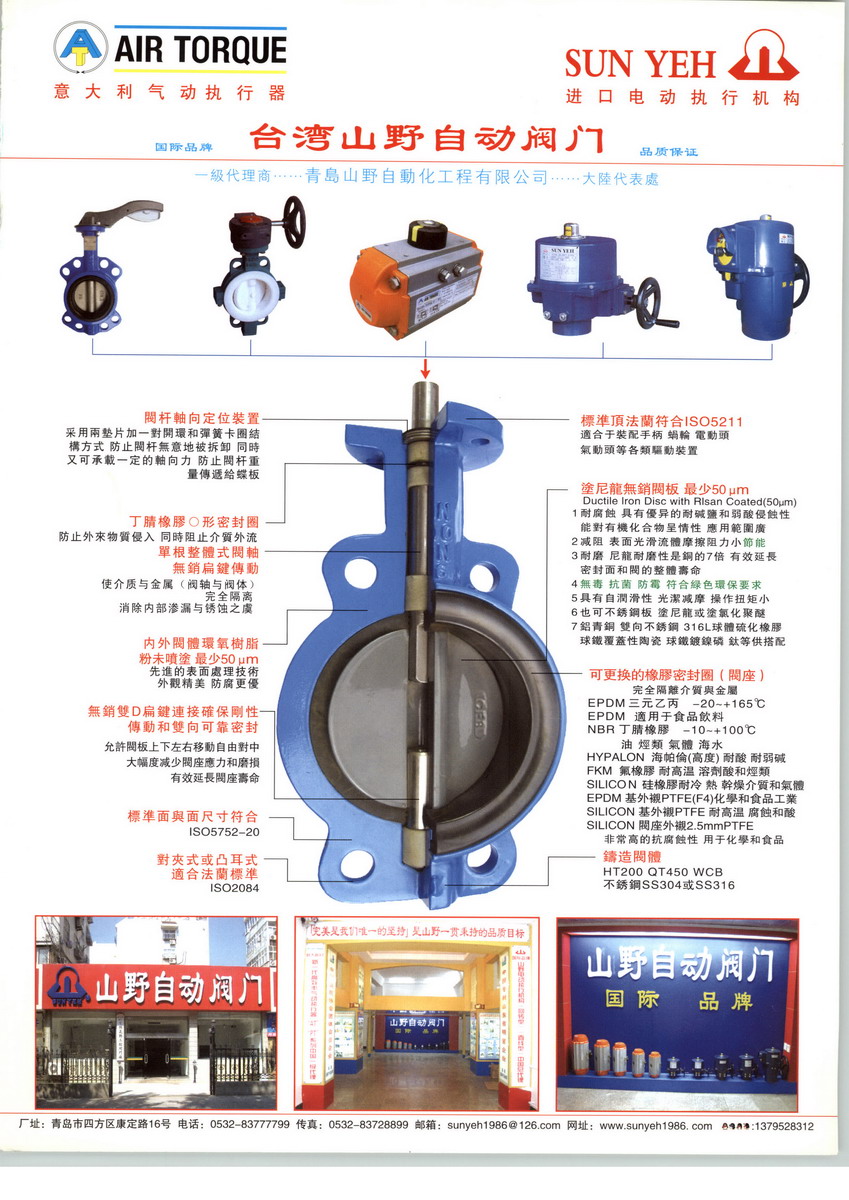 山野SUN YEH自动阀门创业于1986年,从事研发、设计、制造,并在控制阀领域历经几十年实践,追求永无止尽之品质改善,坚持完美的设计理念,生产高性能的产品,通过销售、积累了丰富的技术和经验,深受广大用户认可。为更好适应市场需要,青岛山野自动化工程有限公司于2008年引进SUN YEH品牌的产品来大陆销售推广,设立总库和技术中心。台湾山野SUN YEH生产的四分之一转(回转型电动执行器),弹簧复归(单作用电动执行器)及直线型电动驱动器,山野电动执行器主要特色之一是无离合器,既无须停电即可手动操作,已获多国专利。山野电动驱动器是建立于高品质的水准上,且获得ISO9001、CE、CSA(符合屋外使用标准)、ROHS认证,『完美是我们唯一的坚持』是山野一贯秉持的品质目标。台湾山野SUN YEH电动执行机构得到国内外许多用户和阀门厂商指定配套合作厂家。意大利AIR TORQUEs.p.A(简称AT)成立于1990年,是欧洲最大的专业从事气动阀门执行器生产商。也是目前全球专业生产气动阀门执行器最大的厂家,年产最高量30万台。其生产的气动执行器以规格齐全,性能优,质量好,创新快的特点,在全球拥有高知名度与极佳的评价,成为著名的球阀、蝶阀生产商配套的首选产品。为更好的服务于广大的客户,授权青岛山野自动化工程有限公司为一级代理商。同时公司也是日本西部电机seibu-wonder多回转型TM系列电动执行器的一级代理商。 青岛山野提供的电动执行器、气动执行器、控制阀及控制阀附件产品均符合国际通用标准,如ISO、DIN、ASTM、BS、JIS等,被广泛用于造纸、石油、化工,环保、医疗、制药、冶金、食品、饮料、发电、供水、水处理、中央空调及工业气体等领域。还可承接控制阀维修及手动改自动业务,我们有先进的校正仪器和研磨平台来管控,用试压设备和流量测试台来保证每一台维修和技改后控制阀的性能。青岛山野执着追求“用户就是老板”的经营理念,首要目标是使顾客满意。我们以全员品管为基础,通过高性能、创新的产品、优良的品质、大量库存和交货快速的服务来实现这一目标,而且我们是作为一个团体来实现这一目标。尽心尽力为客户提供优质的产品和完善的售后服务,诚心诚意寻求合作伙伴共同开发自动阀门市场,满足客户需求。青岛山野自动阀门产品,必定会在您的自动化控制糸统上发挥重大作用,愿通过产品的桥梁来连接你我之间的友谊。